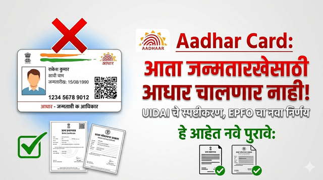 EPFO चा मोठा निर्णय: कर्मचारी भविष्य निर्वाह निधी संघटनेने (EPFO) जानेवारी २०२४ पासूनच जन्मतारीख दुरुस्तीसाठी स्वीकारल्या जाणाऱ्या कागदपत्रांच्या यादीतून आधारला वगळले आहे.
