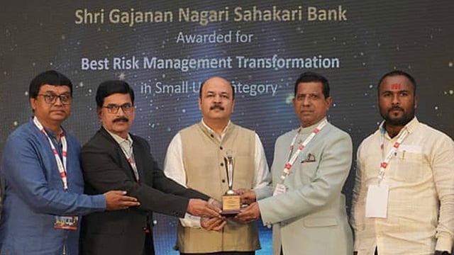 बीड येथील श्री गजानन नागरी सहकारी बँकेला" नॅशनल अर्बन को-ऑपरेटिव्ह फायनान्स ॲन्ड डेव्हलपमेंट कॉर्पोरेशन लिमिटेड नवी दिल्ली (NUCFDC) चे सीईओ प्रभात चतुर्वेदी यांच्या हस्ते नुकताच "बेस्ट रिस्क मॅनेजमेंट ॲवॉर्ड- २०२५" हा पुरस्कार प्रदान करण्यात आला. हा पुरस्कार स्वीकारताना बँकेचे सीईओ महादेव रंगनाथ क्षीरसागर, सरव्यवस्थापक डॉक्टर शेख मंजूर अहमद शेख सलीम, सहायक व्यवस्थापक श्री. सोनार व राठोड उपस्थित होते.