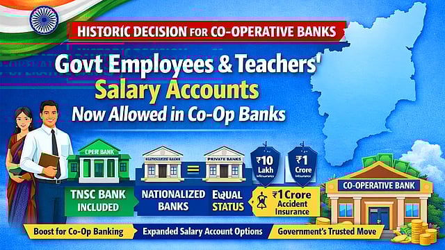 तामिळनाडू :- सरकारने सहकारी बँकिंग क्षेत्रासाठी एक महत्त्वपूर्ण आणि ऐतिहासिक निर्णय घेतला असून, राज्यातील सहकारी बँकांना सरकारी कर्मचारी व शिक्षकांचे पगार खाते ठेवण्याची अधिकृत परवानगी दिली आहे. या निर्णयामुळे सहकारी बँकांना राष्ट्रीयीकृत व खाजगी क्षेत्रातील पॅनेलवर समाविष्ट बँकांच्या समतुल्य दर्जा मिळाला आहे, अशी माहिती अधिकृत सूत्रांनी दिली आहे