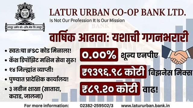 लातूर: सहकार क्षेत्रात आपल्या विश्वासार्हतेचा ठसा उमटवणाऱ्या 'लातूर अर्बन को-ऑपरेटिव्ह बँक लि.' ने आर्थिक वर्ष २०२५-२६ मध्ये अत्यंत समाधानकारक कामगिरी नोंदवली आहे. बँकेने या वर्षात आपल्या व्यवसाय मिश्रणात (Business Mix) तब्बल ₹८९.२० कोटींची भरघोस वाढ केली असून, एकूण व्यवसाय ₹१३९६.९८ कोटींवर पोहोचला आहे.