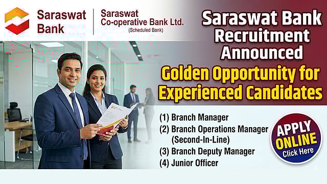मुंबई : Saraswat Co-operative Bank Ltd. या देशातील अग्रगण्य सहकारी बँकेने अनुभवी उमेदवारांसाठी विविध पदांवर भरती जाहीर केली आहे. 100 हून अधिक वर्षांची परंपरा असलेल्या या बँकेच्या देशभरात शेकडो शाखा कार्यरत असून महाराष्ट्रासह अनेक राज्यांत विस्तार आहे.