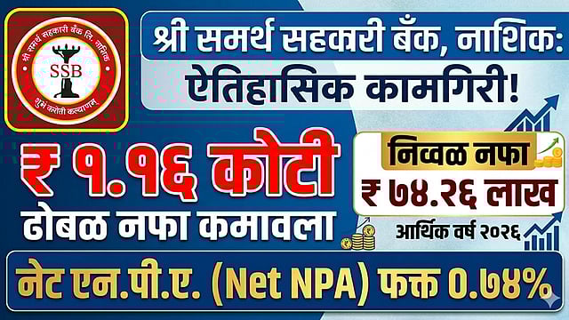 नाशिक: नाशिक येथील श्री समर्थ सहकारी बँकेने ३१ मार्च २०२६ रोजी संपलेल्या आर्थिक वर्षात उल्लेखनीय कामगिरी नोंदवली आहे. बँकेने या वर्षात १ कोटी १६ लाख रुपयांचा ढोबळ नफा (Gross Profit) मिळवला असून, सर्व वैधानिक तरतुदी पूर्ण केल्यानंतर बँकेचा निव्वळ नफा ७४.२६ लाख रुपये झाला आहे. बँकेचे चेअरमन श्री. राधाकृष्ण नाईकवाडे आणि व्हाईस चेअरमन श्री. मनोज बाग यांनी वार्षिक आर्थिक आढावा सादर करताना ही माहिती दिली.