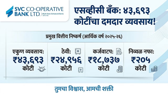 मुंबई: भारतातील आघाडीच्या नागरी सहकारी बँकांपैकी एक असलेल्या 'एसव्हीसी सहकारी बँकेने' (SVC Co-operative Bank) आर्थिक वर्ष २०२५-२६ मध्ये आपली यशस्वी घोडदौड कायम ठेवली आहे. ३१ मार्च २०२६ रोजी संपलेल्या आर्थिक वर्षाच्या लेखापरीक्षित अहवालानुसार, बँकेने ४३,६९३ कोटी रुपयांचा एकूण व्यवसाय नोंदवून बाजारपेठेतील आपले स्थान अधिक मजबूत केले आहे.