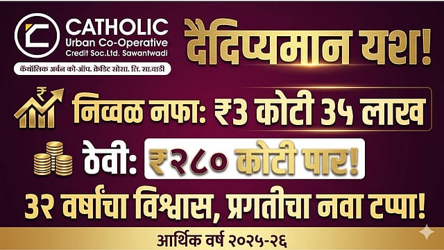 सावंतवाडी: सहकार क्षेत्रात आपल्या पारदर्शक कारभाराने वेगळी ओळख निर्माण करणाऱ्या कॅथॉलिक अर्बन को-ऑपरेटिव्ह क्रेडिट सोसायटी लिमिटेड, सावंतवाडी या संस्थेने आर्थिक वर्ष २०२५-२६ मध्ये दैदिप्यमान यश संपादन केले आहे. ३१ मार्च २०२६ अखेर संपलेल्या आर्थिक वर्षात संस्थेने ३ कोटी ३५ लाख रुपयांचा निव्वळ नफा मिळवला असून, २८० कोटींच्या ठेवींचा टप्पा यशस्वीपणे पार केला आहे.