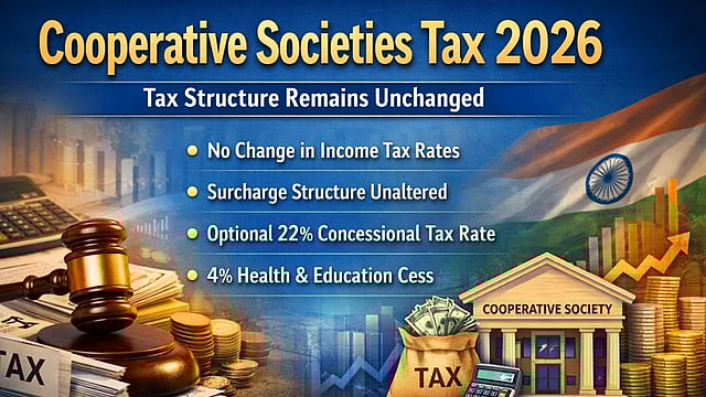 २०२६-२७ या कर वर्षासाठी सहकारी संस्थांवर आयकरासह ४% आरोग्य आणि शिक्षण उपकर लागू राहणार आहे. उपकरावर कोणतीही किरकोळ सवलत उपलब्ध नाही.