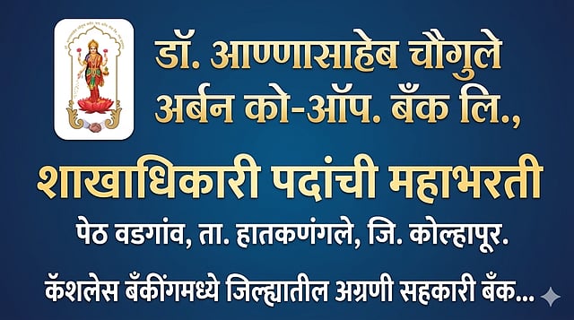 पेठ वडगांव: सहकारी बँकिंग क्षेत्रात स्वतःची स्वतंत्र ओळख निर्माण केलेल्या आणि कोल्हापूर व सांगली जिल्ह्यांत १४ शाखांच्या माध्यमातून कार्यरत असलेल्या डॉ. आण्णासाहेब चौगुले अर्बन को-ऑप बँक लि; पेठ वडगांव येथे 'शाखाधिकारी' (Branch Manager) पदांच्या भरतीसाठी प्रक्रिया सुरू करण्यात आली आहे. भारतीय रिझर्व्ह बँकेच्या निकषांनुसार ही बँक सक्षम (FSWM) वर्गात मोडत असून, विस्तार योजनांच्या पार्श्वभूमीवर अनुभवी उमेदवारांना ही मोठी संधी उपलब्ध झाली आहे.
