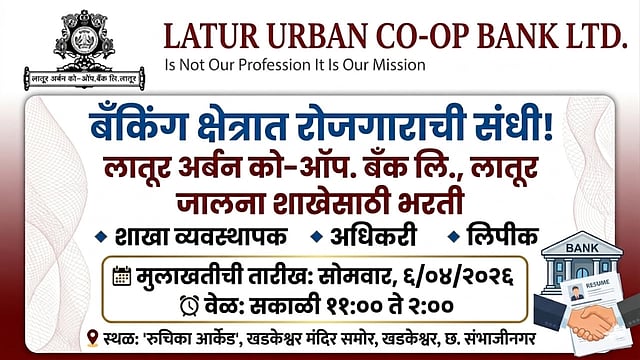 छत्रपती संभाजीनगर: सहकारी बँकिंग क्षेत्रात आपले वेगळे स्थान निर्माण करणाऱ्या लातूर अर्बन को-ऑपरेटिव्ह बँक लिमिटेड, लातूरच्या वतीने जालना येथील नियोजित नवीन शाखेसाठी भरती प्रक्रिया राबवण्यात येत आहे. बँकेचा एकूण व्यवसाय १४०० कोटींच्या टप्प्यावर असून, एकूण २४ शाखांच्या माध्यमातून बँक कार्यरत आहे. या विस्तार प्रक्रियेचा भाग म्हणून जालना शाखेसाठी सक्षम मनुष्यबळाची निवड करण्यासाठी सोमवार, दिनांक ६ एप्रिल २०२६ रोजी थेट मुलाखतींचे (Walk-in Interview) आयोजन करण्यात आले आहे.